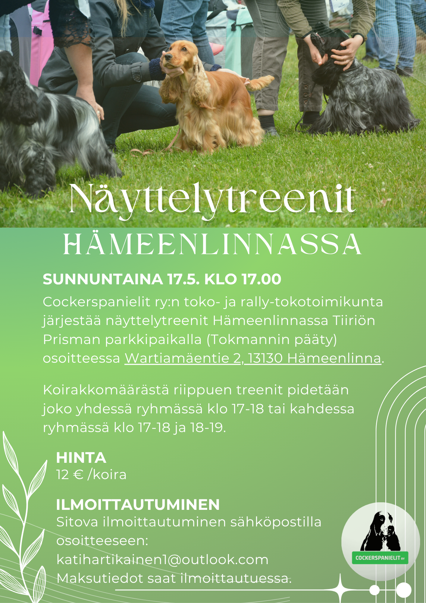 Cockerspanielit ry:n toko- ja rally-tokotoimikunta järjestää näyttelytreenit 17.5.2026 Hämeenlinnassa Tiiriön Prisman parkkipaikalla (Tokmannin pääty) osoitteessa Wartiamäentie 2, 13130 Hämeenlinna.